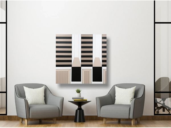 Rather than planning the entire canvas ahead of time, each shape is drawn and painted as it develops, allowing the painting to reveal its direction, sometimes requiring the canvas to be rotated. This spontaneity brings excitement to the process. What brings the most joy is seeing a client’s reaction to a piece. Titles are intentionally avoided, using only numbers, so viewers can interpret the work in their own way, free from influence.